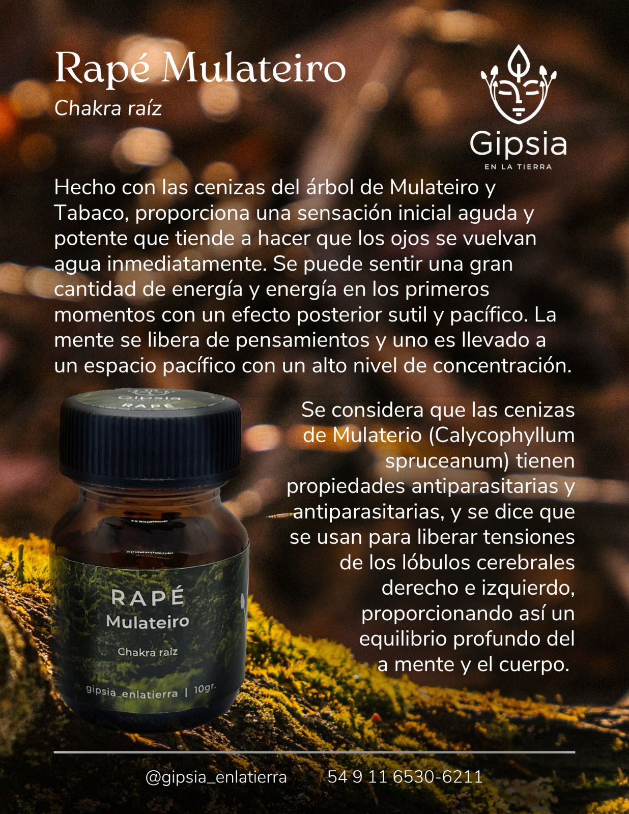 La mente se libera de pensamientos y uno es llevado a un espacio pacífico con un alto nivel de concentración. Se considera que las cenizas de Mulaterio (Calycophyllum spruceanum) tienen propiedades antiparasitarias y antiparasitarias,